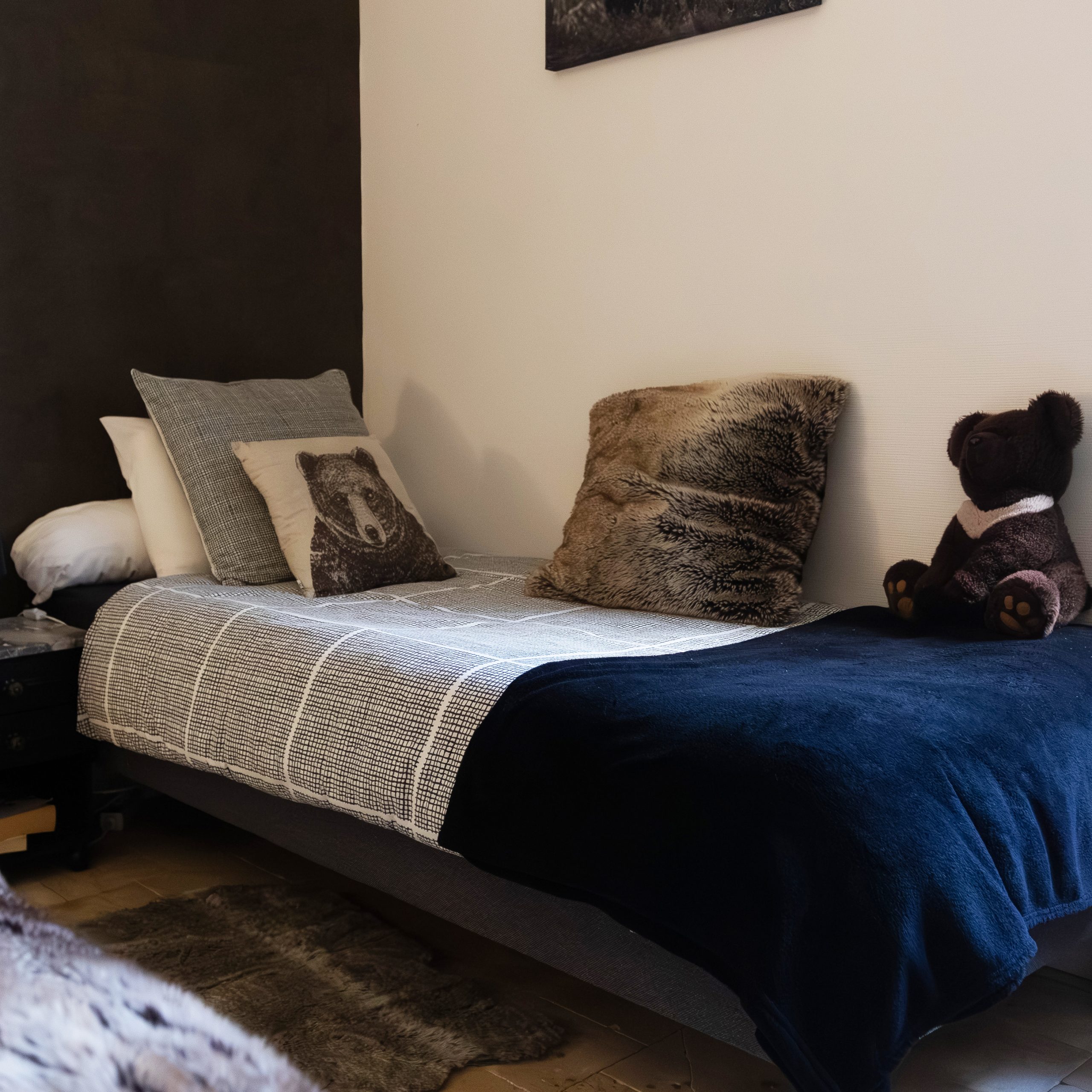 Venez vous reposer dans son lit Queen size, son lit d’une personne et son petit lit bébé.